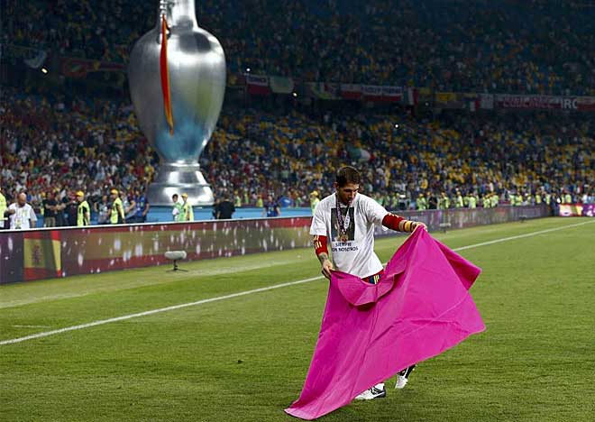 El jugador de la selección española Sergio Ramos celebró, en el estadio de Kiev, la conquista del segundo campeonato consecutivo de Europa con un capote de Alejandro Talavante. El futbolista lo desplegó al finalizar el partido de España-Italia que les dio la tercera Eurocopa, y dio unos pases con él. Foto Marca